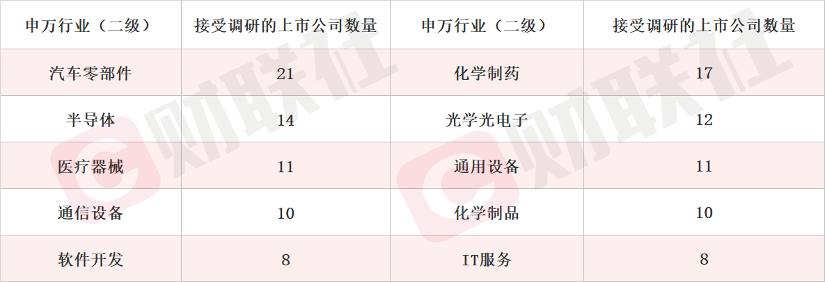细分领域看,汽车零部件、化学制药和半导体板块位列机构关注度前三名。此外,医疗器械、通信设备等行业机构关注度提升。
